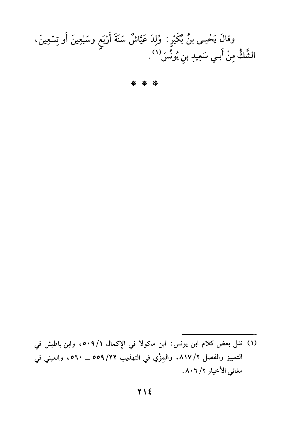 وقال يحيى بن بكير: ولد عياش سنة أربعٍ وسبعين أو تسعين، الشك من أبي سعيد بن يونس.