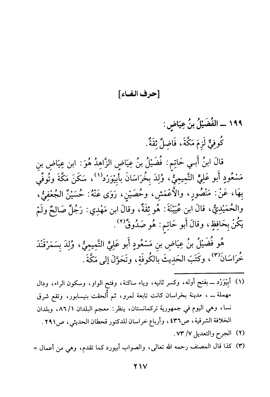 قال ابن أبي حاتم: فضيل بن عياض الزاهد هو: ابن عياض بن مسعود أبو علي التميمي، ولد بخراسان بأبيورد، سكن مكة وتوفي بها، عن: منصور، والأعمش، وحصين، روى عنه: حسين الجعفي، والحميدي، قال ابن عيينة: هو ثقة، وقال ابن مهدي: رجل صالح ولم يكن بحافظ، وقال أبو حاتم: هو صدوقٌ.