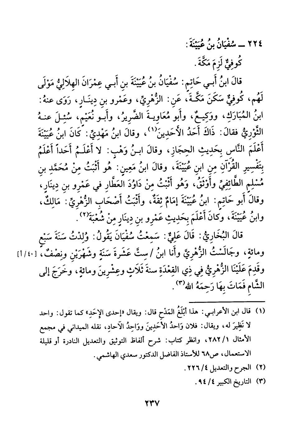 قال ابن أبي حاتم: سفيان بن عيينة بن أبي عمران الهلالي مولى لهم، كوفي سكن مكة، عن: الزهري، وعمرو بن دينار، روى عنه: ابن المبارك، ووكيع، وأبو معاوية الضرير، وأبو نعيم، سئل عنه الثوري فقال: ذاك أحد الأحدين، وقال ابن مهدي: كان ابن عيينة أعلم الناس بحديث الحجاز، وقال ابن وهب: لا أعلم أحداً أعلم بتفسير القرآن من ابن عيينة، وقال ابن معين: هو أثبت من محمد بن مسلم الطائفي وأوثق، وهو أثبت من داود العطار في عمرو بن دينار، وقال أبو حاتم: ابن عيينة إمام ثقة، وأثبت أصحاب الزهري: مالك، وابن عيينة، وكان أعلم بحديث عمرو بن دينار من شعبة.