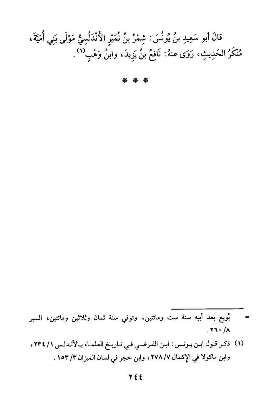 قال أبو سعيد بن يونس: شمر بن نمير الأندلسي مولى بني أمية، منكر الحديث، روى عنه: نافع بن يزيد، وابن وهبٍ.
