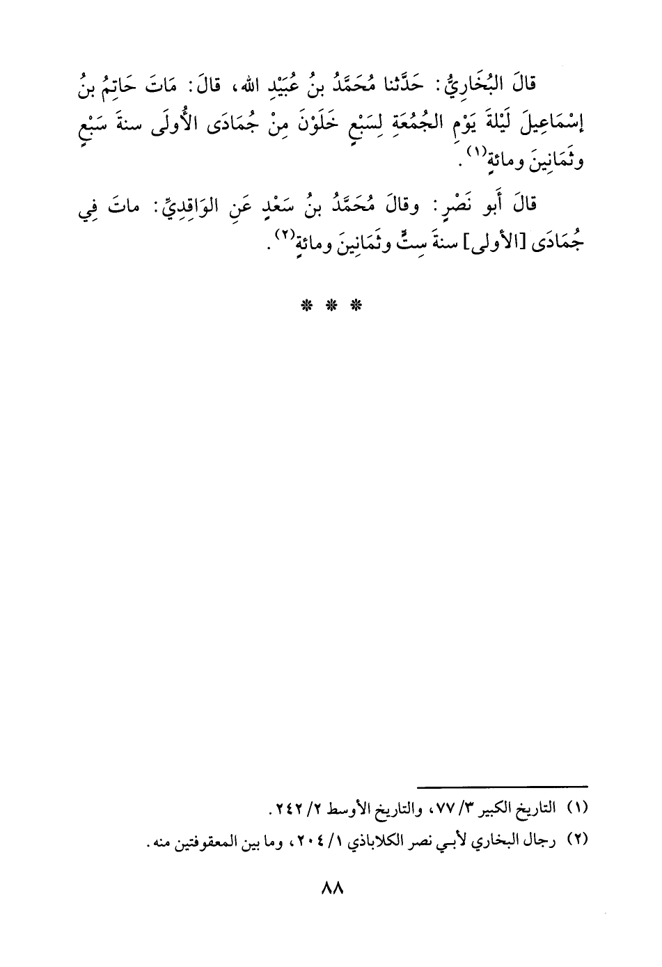 قال البخاري: حدثنا محمد بن عبيد الله، قال: مات حاتم بن إسماعيل ليلة يوم الجمعة لسبع خلون من جمادى الأولى سنة سبع وثمانين ومائةٍ.