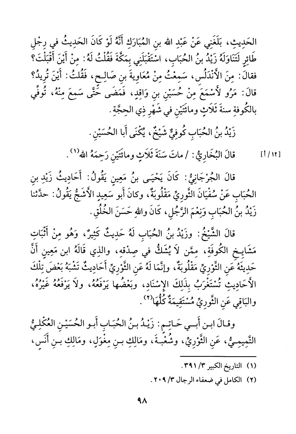 قال الشيخ: وزيد بن الحباب له حديث كثير، وهو من أثبات مشايخ الكوفة، ممن لا يشك في صدقه، والذي قاله ابن معين أن حديثه عن الثوري مقلوبة، وإنما له عن الثوري أحاديث تشبه بعض تلك الأحاديث تستغرب بذلك الإسناد، وبعضها يرفعه، ولا يرفعه غيره، والباقي عن الثوري مستقيمة كلها.