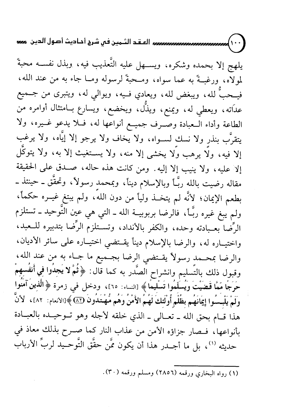 يلهج إلا بحمده وشكره, ويسهل عليه التعذيب فيه, وبذل نفسه محبة لمولاه, ورغبة به عما سواه, ومحبة لرسوله وما جاء به من عند الله, فيحب لله, ويبغض لله, ويعادي فيه, ويوالي له, ويتبرى من جميع عداته, ويعطي له, ويمنع, ويذل, ويخضع, ويسارع بامتثال أوامره من الطاعة وأداء العبادة وصرف جميع أنواعها له, فلا يدعو غيره, ولا يتقرب بنذر ولا نسك لسواه, ولا يخاف ولا يرجو إلا إياه, ولا يرغب إلا فيه, ولا يرهب ولا يخشى إلا منه, ولا يستغيث إلا به, ولا يتوكل إلا عليه, ولا ينيب إلا إليه. ومن كانت هذه حاله, صدق على الحقيقة مقاله رضيت بالله ربا وبالإسلام دينا, وبمحمد رسولا, وتحقق حينئذ بطعم الإيمان؛ لأنه لم يتخذ وليا من دون الله, ولم يبتغ غيره حكما, ولم يبغ غيره ربا, فالرضا بربوبية الله التي هي عين التوحيد تستلزم الرضا بعبادته وحده, والكفر بالأنداد, وتستلزم الرضا بتدبيره للعبد, واختياره له, والرضا بالإسلام دينا يقتضي اختياره على سائر الأديان, والرضا بمحمد رسولا يقتضي الرضا بجميع ما جاء به من عند الله, وقبول ذلك بالتسليم وانشراح الصدر به كما قال: {ثُمَّ لا يَجِدُوا فِي أَنْفُسِهِمْ حَرَجاً مِمَّا قَضَيْتَ وَيُسَلِّمُوا تَسْلِيماً} (النساء: من الآية 65) , ودخل في زمرة {الَّذِينَ آمَنُوا وَلمْ يَلْبِسُوا إِيمَانَهُمْ بِظُلْمٍ أُولئِكَ لهُمُ الْأَمْنُ وَهُمْ مُهْتَدُونَ} (الأنعام:82) , لأن هذا قام بحق الله تعالى الذي خلقه لأجله وهو توحيده بالعبادة بأنواعها, فصار جزاؤه الأمن من عذاب النار كما صرح بذلك معاذ في حديثه (1) , بل ما أجدر هذا أن يكون ممن حقق التوحيد لرب الأرباب
