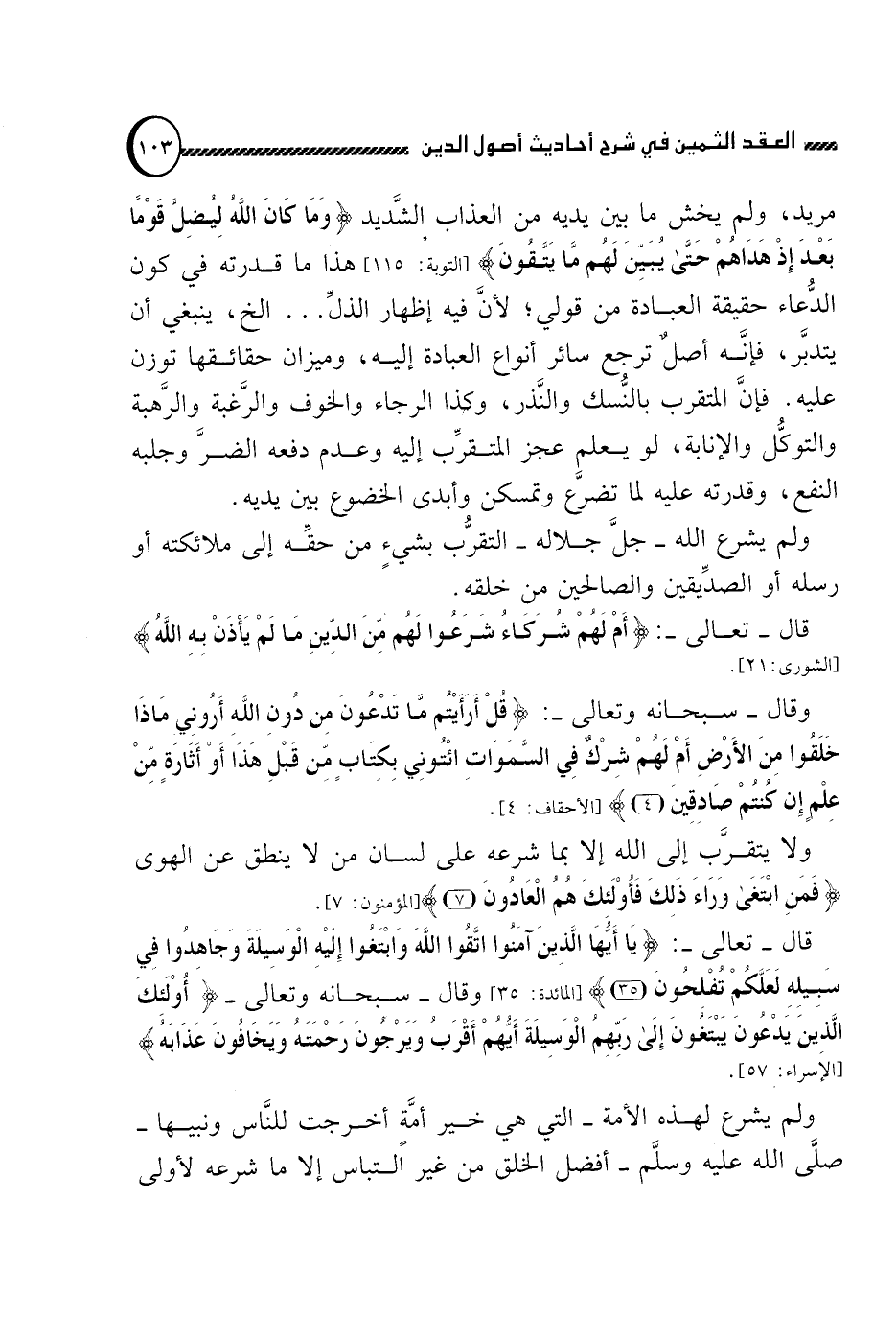مريد, ولم يخش ما بين يديه من العذاب الشديد {وَمَا كَانَ اللَّهُ لِيُضِلَّ قَوْماً بَعْدَ إِذْ هَدَاهُمْ حَتَّى يُبَيِّنَ لهُمْ مَا يَتَّقُونَ} (التوبة: من الآية 115) هذا ما قدرته في كون الدعاء حقيقة العبادة من قولي؛ لأن فيه إظهار الذل ... الخ, ينبغي أن يتدبر, فإنه أصل ترجع سائر أنواع العبادة إليه, وميزان حقائقها توزن عليه. فإن المتقرب بالنسك والنذر, وكذا الرجاء والخوف والرغبة والرهبة والتوكل والإنابة, لو يعلم عجز المتقرب إليه وعدم دفعه الضر وجلبه النفع, وقدرته عليه لما تضرع وتمسكن وأبدى الخضوع بين يديه.