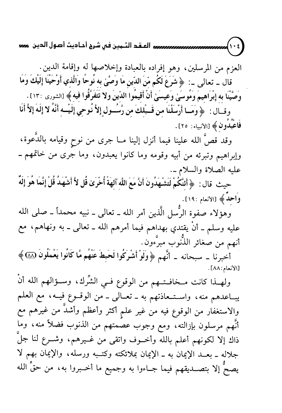 ولهذا كانت مخافتهم من الوقوع في الشرك, وسؤالهم الله أن يباعدهم منه, واستعاذتهم به تعالى من الوقوع فيه, مع العلم والاستغفار من الوقوع فيه من غير علم أكثر وأعظم وأشد من غيرهم مع أنهم مرسلون بإزالته, ومع وجوب عصمتهم من الذنوب فضلا منه, وما ذاك إلا لكونهم أعلم بالله وأخوف واتقى من غيرهم, وشرع لنا جل جلاله بعد الإيمان به الإيمان بملائكته وكتبه ورسله, والإيمان بهم لا يصح إلا بتصديقهم فيما جاءوا به وجميع ما أخبروا به, من حق الله