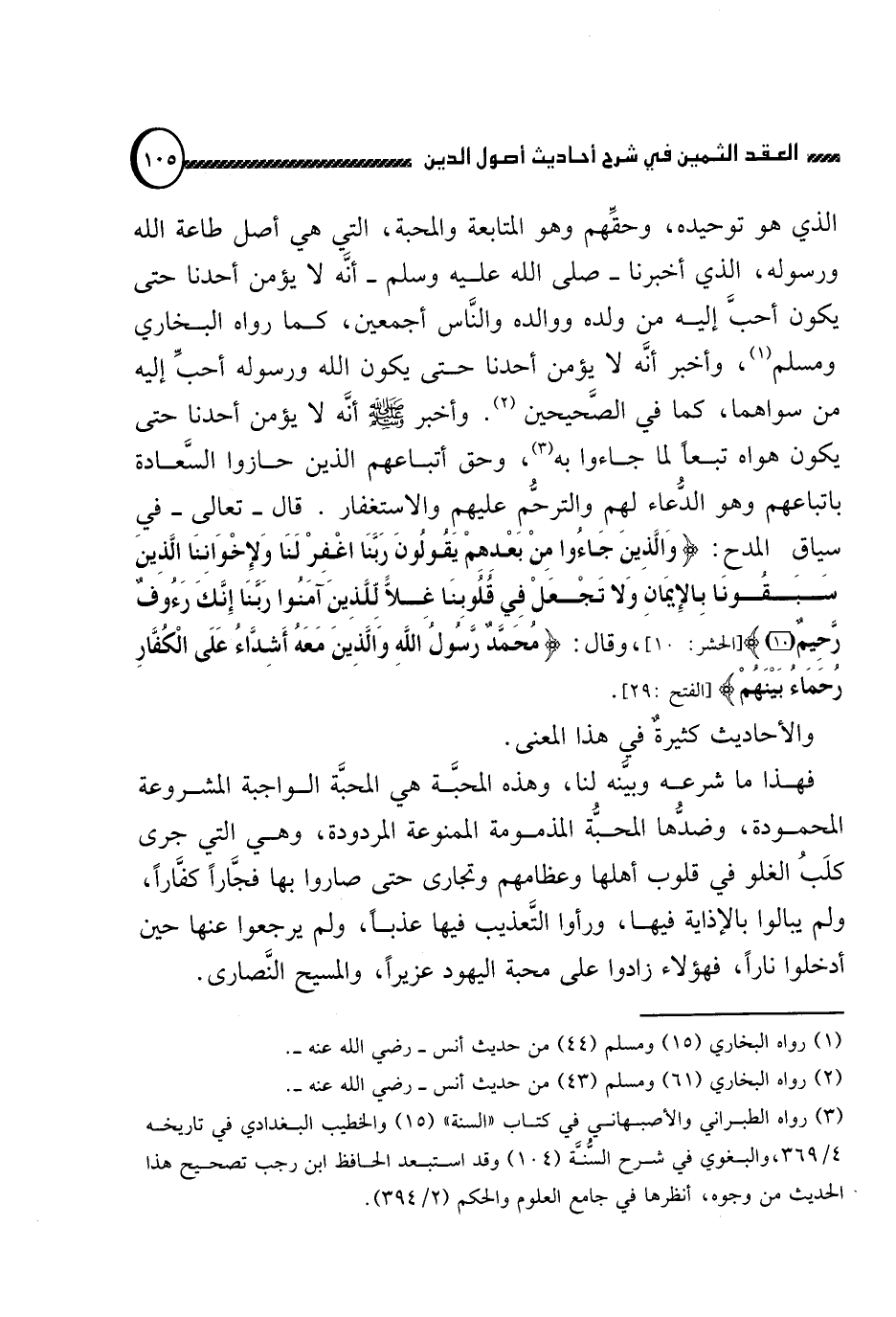 الذي هو توحيده, وحقهم وهو المتابعة والمحبة, التي هي أصل طاعة الله ورسوله, الذي أخبرنا صلى الله عليه وسلم أنه لا يؤمن أحدنا حتى يكون أحب إليه من ولده ووالده والناس أجمعين, كما رواه البخاري ومسلم (1) , وأخبر أنه لا يؤمن أحدنا حتى يكون الله ورسوله أحب إليه من سواهما, كما في الصحيحين (2) . وأخبر صلى الله عليه وسلم أنه لا يؤمن أحدنا حتى يكون هواه تبعا لما جاءوا به (3) , وحق أتباعهم الذين حازوا السعادة باتباعهم وهو الدعاء لهم والترحم عليهم والاستغفار. قال تعالى في سياق المدح: {وَالَّذِينَ جَاءُوا مِنْ بَعْدِهِمْ يَقُولُونَ رَبَّنَا اغْفِرْ لنَا وَلِإِخْوَانِنَا الَّذِينَ سَبَقُونَا بِالإِيمَانِ وَلا تَجْعَلْ فِي قُلُوبِنَا غِلّاً لِلَّذِينَ آمَنُوا رَبَّنَا إِنَّكَ رَؤُوفٌ رَحِيمٌ} (الحشر:10) , وقال: {مُحَمَّدٌ رَسُولُ اللَّهِ وَالَّذِينَ مَعَهُ أَشِدَّاءُ عَلى الْكُفَّارِ رُحَمَاءُ بَيْنَهُمْ} (الفتح: من الآية 29) .