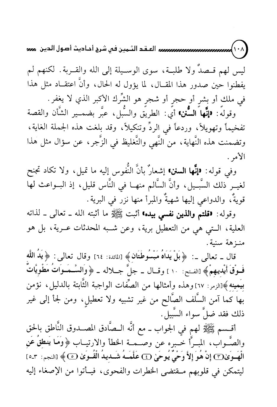 قال تعالى: {بَلْ يَدَاهُ مَبْسُوطَتَانِ} (المائدة: من الآية 64) وقال تعالى: {يَدُ اللَّهِ فَوْقَ أَيْدِيهِمْ} (الفتح: من الآية 10) وقال جلاله {وَالسَّمَاوَاتُ مَطْوِيَّاتٌ بِيَمِينِهِ} (الزمر: من الآية 67) وهذه وأمثالها من الصفات الواجبة الثابتة بالدليل, نؤمن بها كما آمن السلف الصالح من غير تشبيه ولا تعطيل, ومن لجأ إلى غير ذلك فقد ضل سواء السبيل.