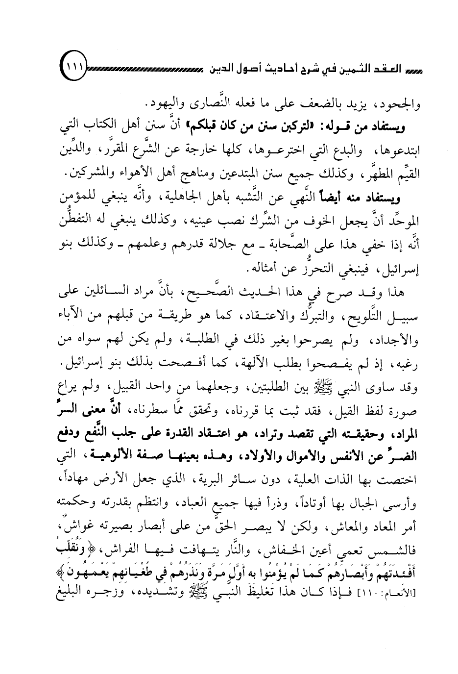 وقد ساوى النبي صلى الله عليه وسلم بين الطلبتين, وجعلهما من واحد القبيل, ولم يراع صورة لفظ القيل, فقد ثبت بما قررناه, وتحقق مما سطرناه, أن معنى السر المراد, وحقيقته التي تقصد وتراد, هو اعتقاد القدرة على جلب النفع ودفع الضر عن الأنفس والأموال والأولاد, وهذه بعينها صفة الألوهية , التي اختصت بها الذات العلية, دون سائر البرية, الذي جعل الأرض مهادا, وأرسى الجبال أوتادا, وذرأ فيها جميع العباد, وانتظم بقدرته وحكمته أمر المعاد والمعاش, ولكن لا يبصر الحق من على أبصار بصيرته غواش, فالشمس تعمي أعين الخفاش, والنار يتهافت فيها الفراش, {وَنُقَلِّبُ أَفْئِدَتَهُمْ وَأَبْصَارَهُمْ كَمَا لمْ يُؤْمِنُوا بِهِ أَوَّل مَرَّةٍ وَنَذَرُهُمْ فِي طُغْيَانِهِمْ يَعْمَهُونَ} (الأنعام:110) فإذا كان هذا تغليظ النبي صلى الله عليه وسلم وتشديده, وزجره البليغ