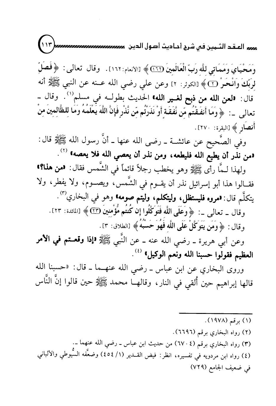 وَمَحْيَايَ وَمَمَاتِي لِلَّهِ رَبِّ الْعَالمِينَ} (الأنعام:162) . وقال تعالى: {فَصَلِّ لِرَبِّكَ وَانْحَرْ} (الكوثر:2) وعن علي رضي الله عنه عن النبي صلى الله عليه وسلم أنه قال: "لعن الله من ذبح لغير الله" الحديث بطوله في مسلم (1) . وقال تعالى: {وَمَا أَنْفَقْتُمْ مِنْ نَفَقَةٍ أَوْ نَذَرْتُمْ مِنْ نَذْرٍ فَإِنَّ اللَّهَ يَعْلمُهُ وَمَا لِلظَّالِمِينَ مِنْ أَنْصَارٍ} (البقرة:270) .