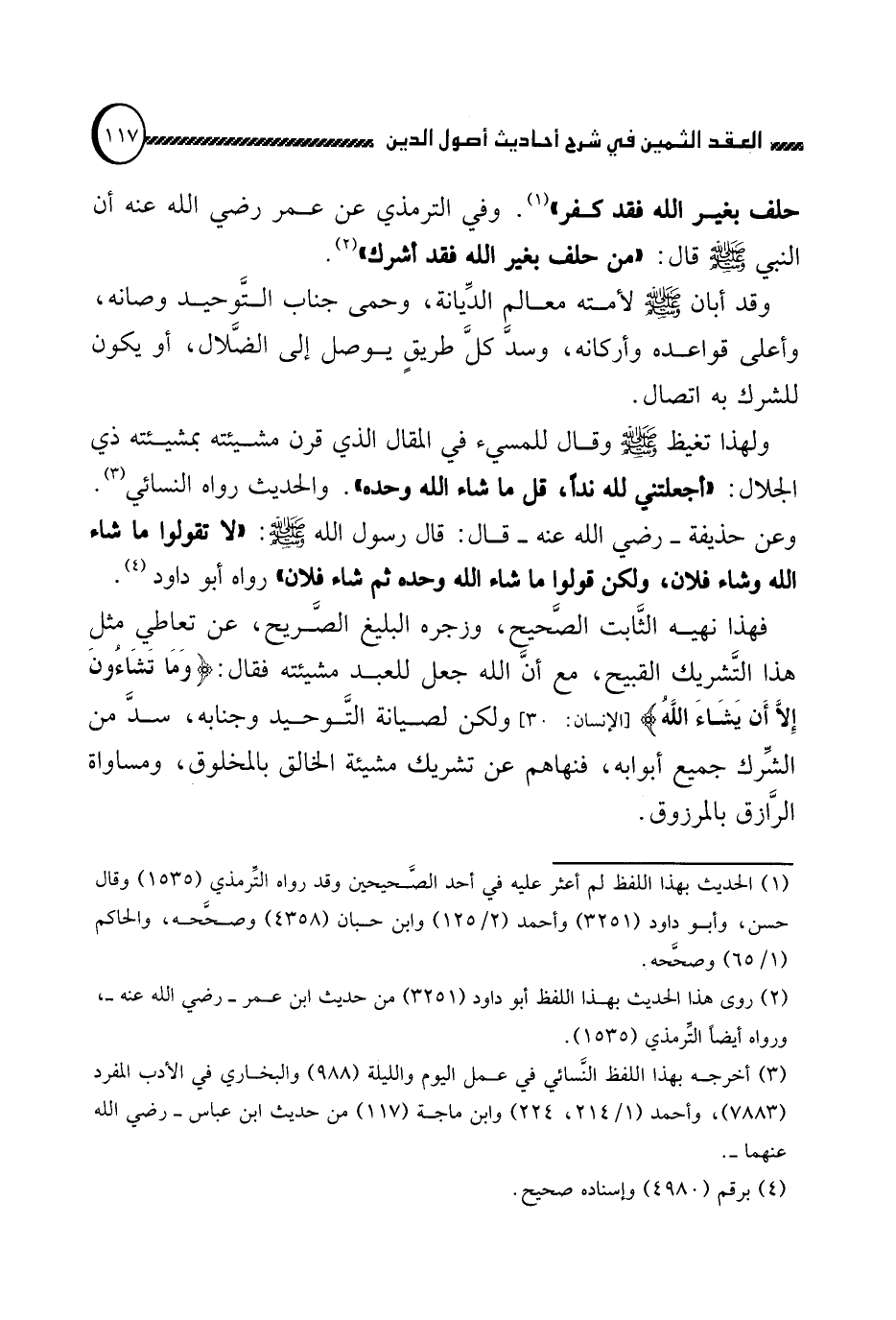 فهذا نهيه الثابت الصحيح, وزجره البليغ الصريح, عن تعاطي مثل هذا التشريك القبيح, مع أن الله جعل للعبد مشيئته فقال: {وَمَا تَشَاءُونَ إِلاَّ أَنْ يَشَاءَ اللَّهُ} (الإنسان: من الآية 30) ولكن لصيانة التوحيد وجنابه, سد من الشرك جميع أبوابه, فنهاهم عن تشريك مشيئة الخالق بالمخلوق, ومساواة الرازق بالمرزوق.