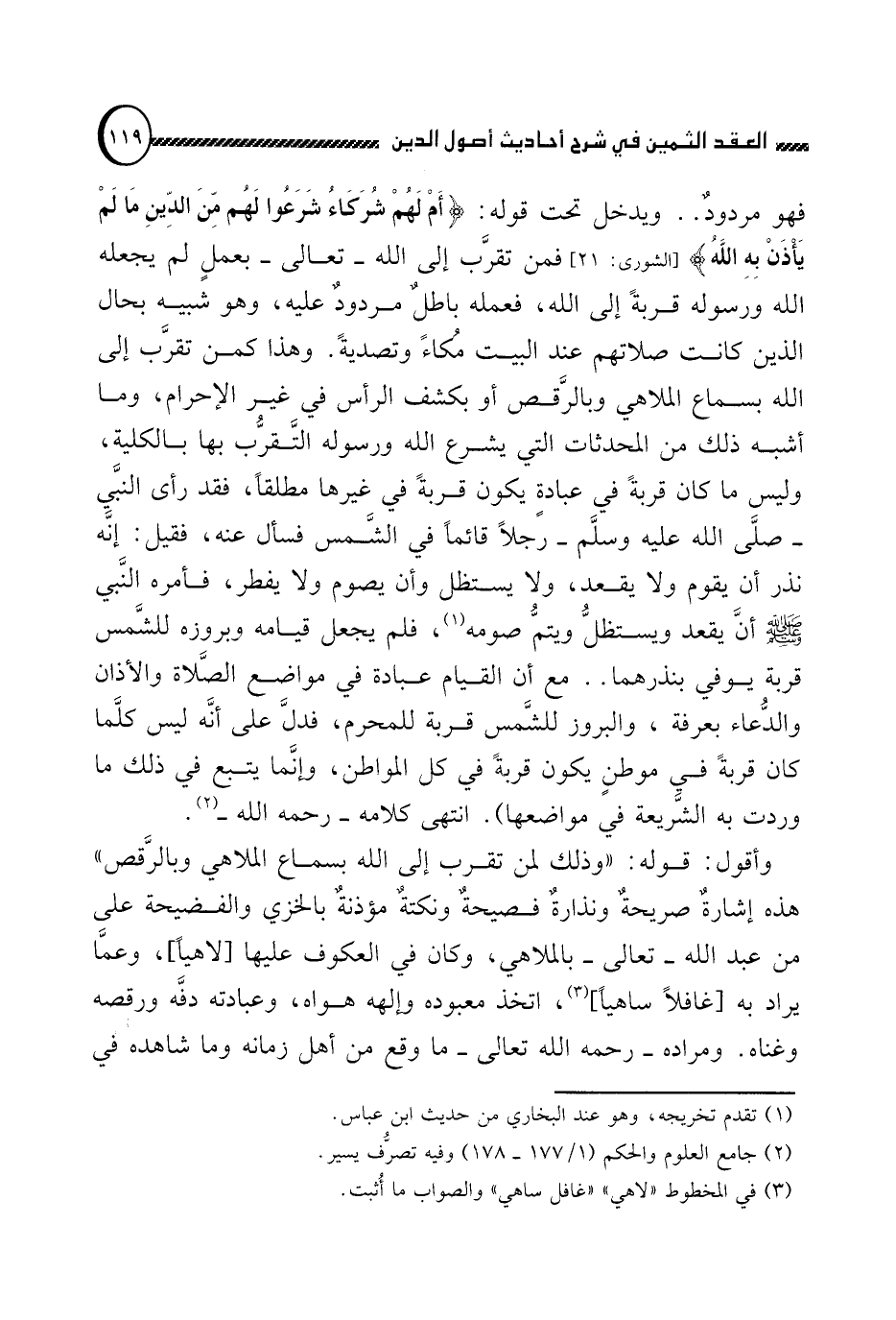وأقول: قوله: "وذلك لمن تقرب إلى الله بسماع الملاهي وبالرقص" هذه إشارة صريحة ونذارة فصيحة ونكتة مؤذنة بالخزي والفضيحة على من عبد الله تعالى بالملاهي , وكان في العكوف عليها [لاهيا] ,وعما يراد به [غافلا ساهيا] (3) , اتخذ معبوده وإلهه هواه, وعبادته دفه ورقصه وغناه. ومراده رحمه الله تعالى ما وقع من أهل زمانه وما شاهده في