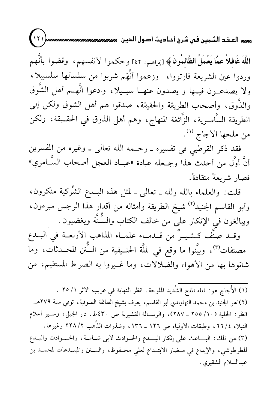قلت: والعلماء بالله ولله تعالى لمثل هذه البدع الشركية منكرون, وأبو القاسم الجنيد (2) , شيخ الطريقة وأمثاله من أقذار هذا الرجس مبرءون, ويبالغون في الإنكار على من خالف الكتاب والسنة ويغضبون.