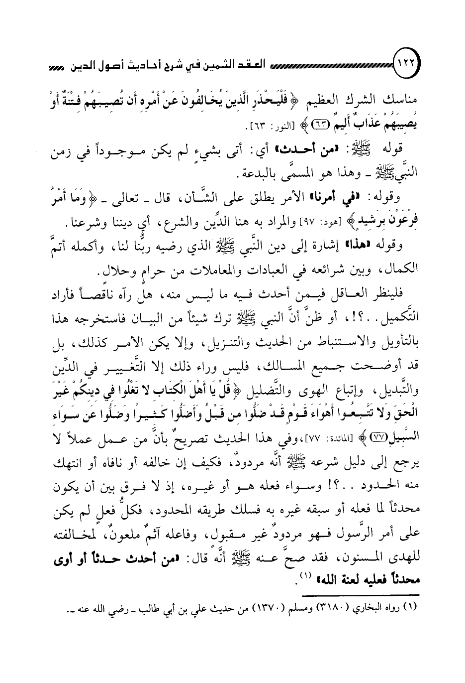 فلينظر العقل فيمن أحدث فيه ما ليس منه, هل رآه ناقصا فأراد التكميل..؟! , أو ظن أن النبي صلى الله عليه وسلم ترك شيئا من البيان فاستخرجه هذا بالتأويل والاستنباط من الحديث والتنزيل, وإلا يكن الأمر كذلك, بل قد أوضحت جميع المسالك, فليس وراء ذلك إلا التغيير في الدين والتبديل, وإتباع الهوى والتضليل {قُلْ يَا أَهْل الْكِتَابِ لا تَغْلُوا فِي دِينِكُمْ غَيْرَ الْحَقِّ وَلا تَتَّبِعُوا أَهْوَاءَ قَوْمٍ قَدْ ضَلُّوا مِنْ قَبْلُ وَأَضَلُّوا كَثِيراً وَضَلُّوا عن سَوَاءِ السَبِيلِ} (المائدة: من الآية 77) وفي هذا الحديث تصريح بان من عمل عملا لا يرجع إلى دليل شرعه صلى الله عليه وسلم أنه مردود, فكيف إن خالفه أو نافاه أو انتهك منه الحدود..؟! وسواء فعله هو أو غيره, إذ لا فرق بين أن يكون محدثا لما فعله أو سبقه غيره به فسلك طريقه المحدود, فكل فعل لم يكن على أمر الرسول فهو مردود غير مقبول, وفاعله آثم ملعون, لمخالفته للهدى المسنون, فقد صح عنه صلى الله عليه وسلم أنه قال: "من أحدث حدثا أو آوى محدثا فعليه لعنة الله" (1) .