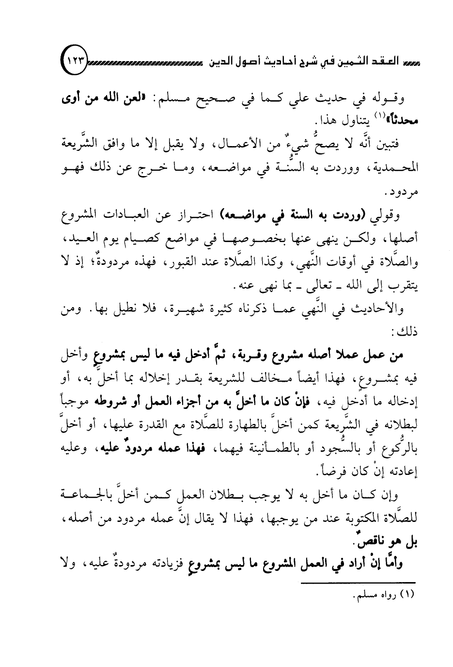 وقولي (وردت به السنة في مواضعه) احتراز عن العبادات المشروع أصلها, ولكن ينهى عنها بخصوصها في مواضع كصيام يوم العيد, والصلاة في أوقات النهي, وكذا الصلاة عند القبور, فهذه مردودة؛ إذ لا يتقرب إلى الله تعالى بما نهى عنه.