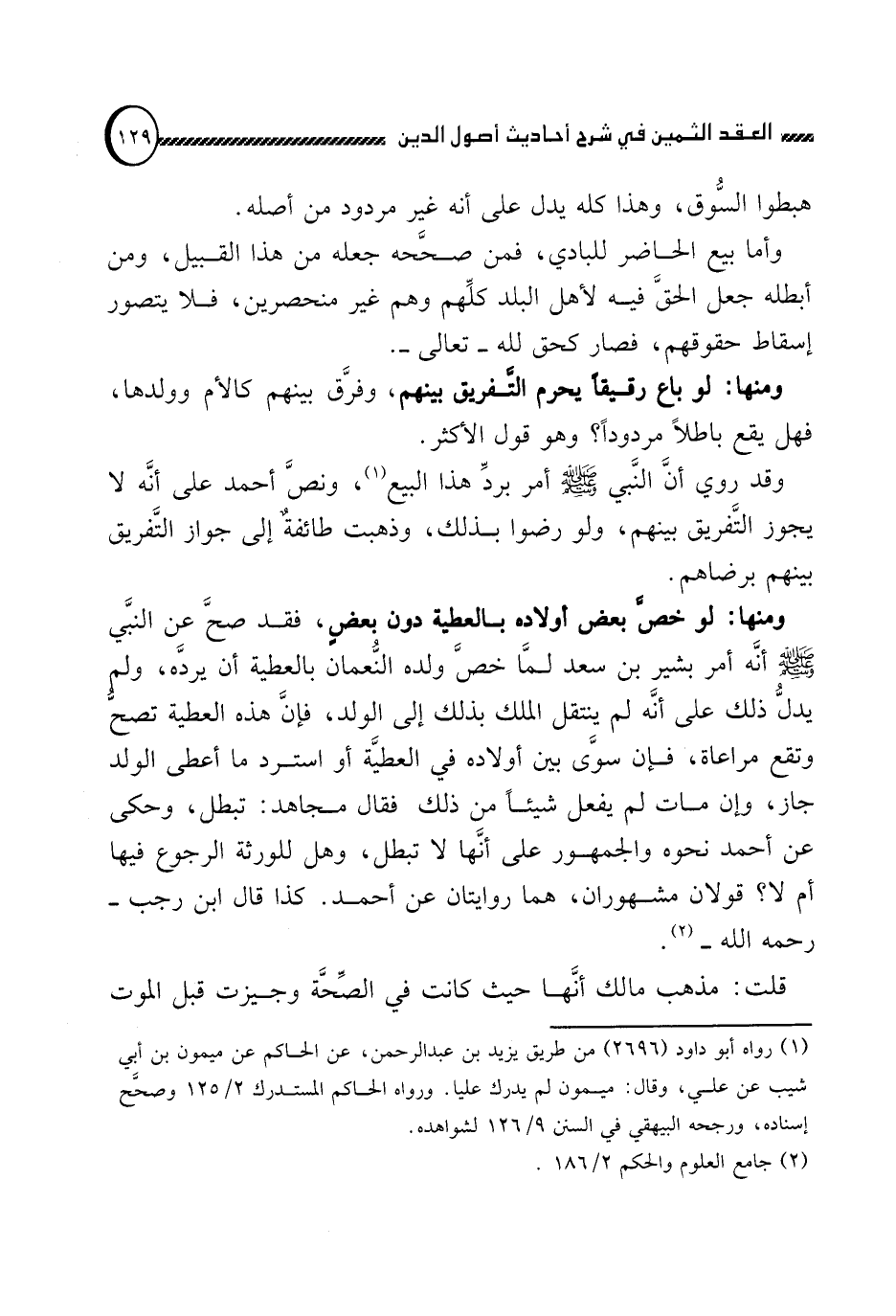 ومنها: لو خص بعض أولاده بالعطية دون بعض, فقد صح عن النبي صلى الله عليه وسلم أنه أمر بشير بن سعد لما خص ولده النعمان بالعطية أن يرده, ولم يدل ذلك على أنه لم ينتقل الملك بذلك إلى الولد, فإن هذه العطية تصح وتقع مراعاة, فإن سوى بين أولاده في العطية أو استرد ما أعطى الولد جاز, وإن مات لم يفعل شيئا من ذلك فقال مجاهد: تبطل, وحكى عن أحمد نحوه والجمهور على أنها لا تبطل, وهل للورثة الرجوع فيها أم لا؟ قولان مشهوران, هما روايتان عن أحمد. كذا قال ابن رجب رحمه الله (2) .