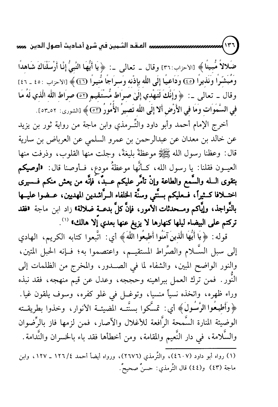 أخرج الإمام أحمد وأبو داود والترمذي وابن ماجة من رواية ثور بن يزيد عن خالد بن معدان عن عبد الرحمن بن عمرو السلمي عن العرباض بن سارية قال: وعظنا رسول الله صلى الله عليه وسلم موعظة بليغة, وجلت منها القلوب, وذرفت منها العيون فقلنا: يا رسول الله, كأنها موعظة مودع, فأوصنا قال: "أوصيكم بتقوى الله والسمع والطاعة وإن تأمر عليكم عبد فإنه من يعش منكم فسيرى اختلافا كثيرا, فعليكم بسنتي وسنة الخلفاء الراشدين المهديين, عضوا عليها بالنواجذ, وإياكم ومحدثات الأمور, فإن كل بدعة ضلالة" زاد ابن ماجة "فقد تركتم على البيضاء ليلها كنهارها لا يزيغ عنها بعدي إلا هالك" (1) .