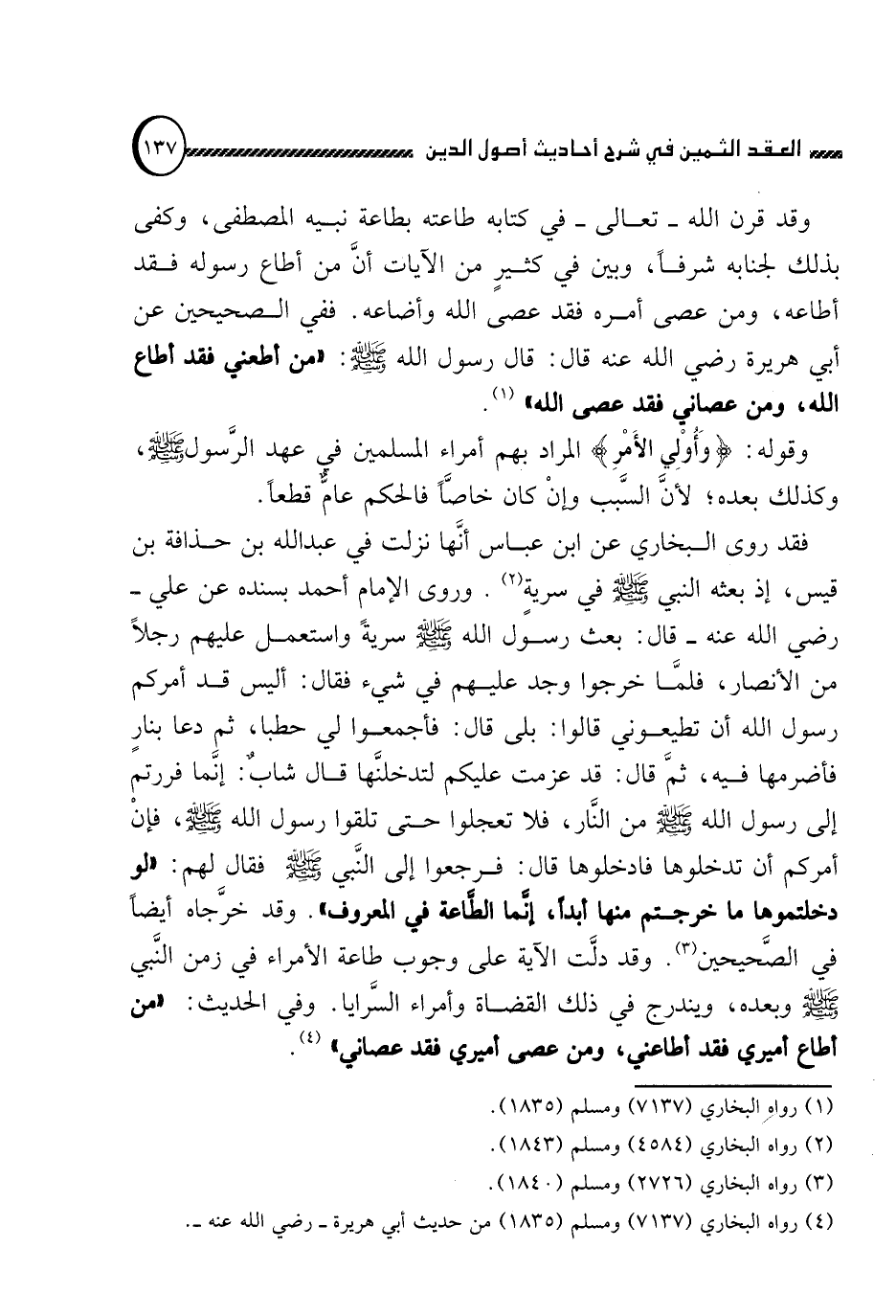 وقد قرن الله تعالى في كتابه طاعته بطاعة نبيه المصطفى, وكفى بذلك لجنابه شرفا, وبين في كثير من الآيات أن من أطاع رسوله فقد أطاعه, ومن عصى أمره فقد عصى الله وأضاعه. ففي الصحيحين عن أبي هريرة رضي الله عنه قال: قال رسول الله صلى الله عليه وسلم: "من أطاعني فقد أطاع الله, ومن عصاني فقد عصى الله" (1) .