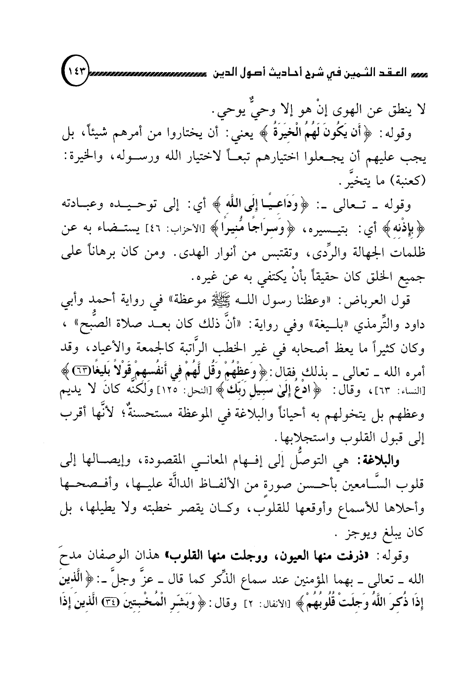 والبلاغة: هي التوصل إلى إفهام المعاني المقصودة, وإيصالها إلى قلوب السامعين بأحسن صورة من الألفاظ الدالة عليها, وأفصحها وأحلاها للأسماع وأوقعها للقلوب, وكان يقصر خطبته ولا يطيلها, بل كان يبلغ ويجيز.