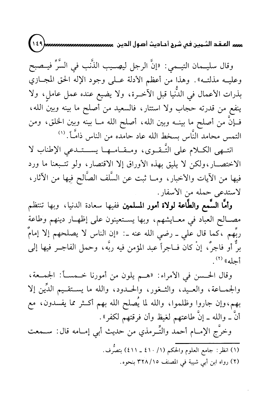 وأما السمع والطاعة لولاة أمور المسلمين ففيها سعادة الدنيا, وبها تنتظم مصالح العباد في معايشهم, وبها يستعينون على إظهار دينهم وطاعة ربهم, كما قال علي رضي الله عنه: "إن الناس لا يصلحهم إلا إمام بر أو فاجر, إن كان فاجرا عبد المؤمن فيه ربه, وحمل الفاجر فيها إلى أجله" (2) .