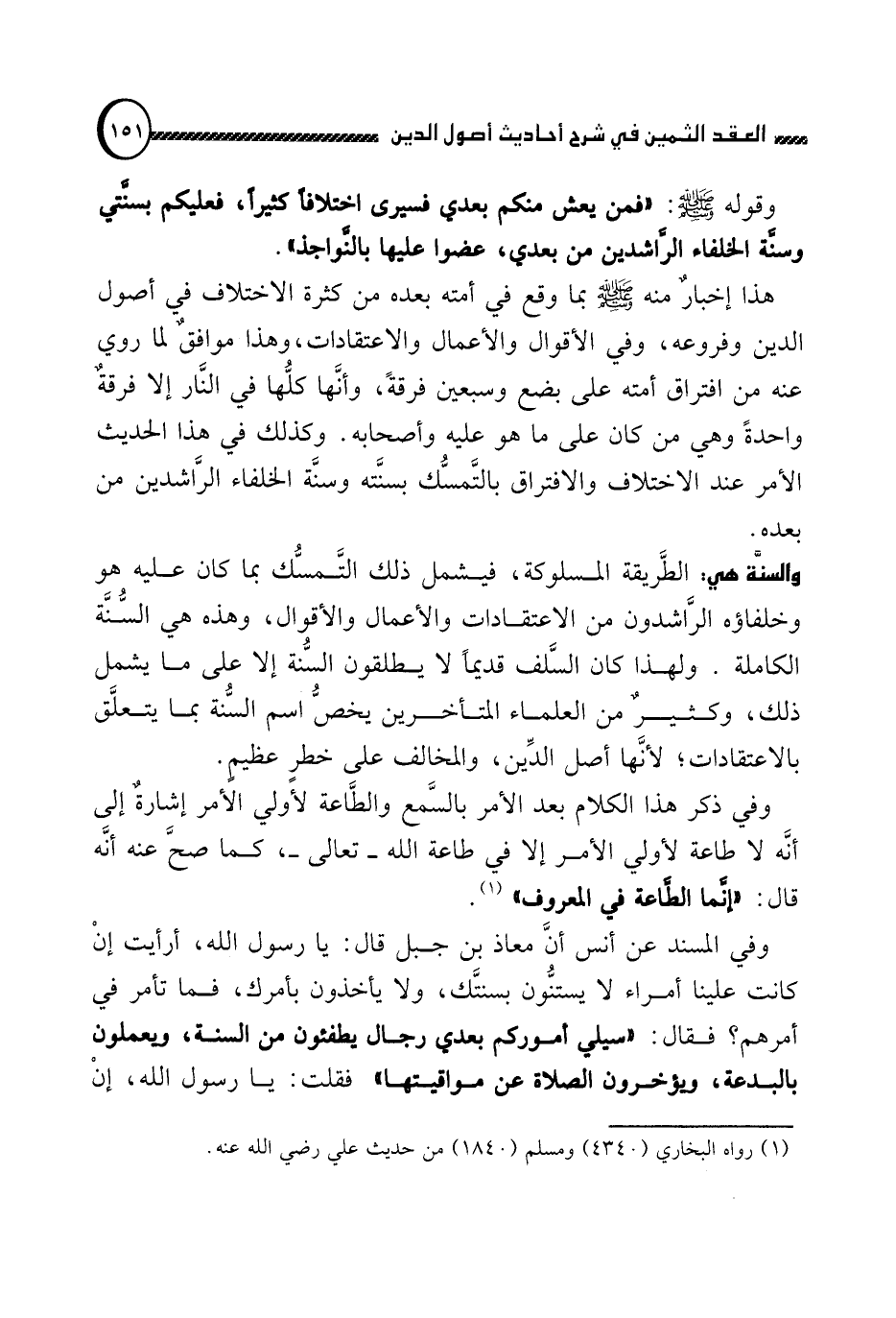 وقوله صلى الله عليه وسلم: "فمن يعش منكم فسيرى اختلافا كثيرا, فعليكم بسنتي وسنة الخلفاء الراشدين المهديين من بعدي, عضوا عليها بالنواجذ".