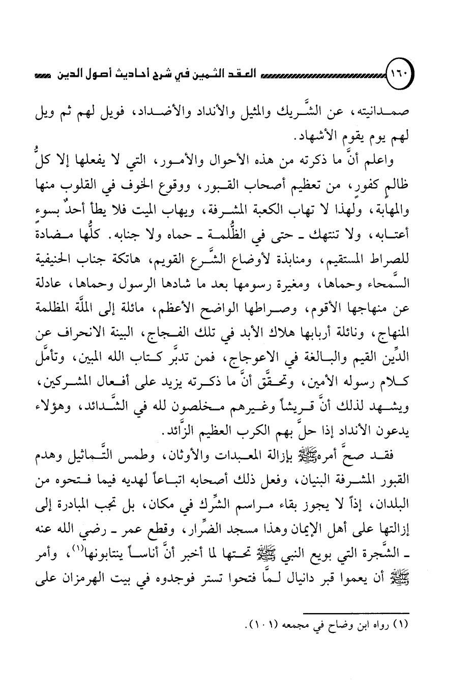 فقد صح أمره صلى الله عليه وسلم بإزالة المعبدات والأوثان, وطمس التماثيل وهدم القبور المشرفة البنيان, وفعل ذلك أصحابه اتباعا لهديه فيما فتحوه من البلدان, إذا لا يجوز بقاء مراسم الشرك في مكان, بل تجب المبادرة إلى إزالتها على أهل الإيمان وهذا مسجد الضرار, وقطع عمر رضي الله عنه الشجرة التي بويع النبي صلى الله عليه وسلم تحتها لما أخبر أن أناسا ينتابونها (1) , وأمر صلى الله عليه وسلم أن يعموا قبر دانيال لما فتحوا تستر فوجدوه في بيت الهرمزان على