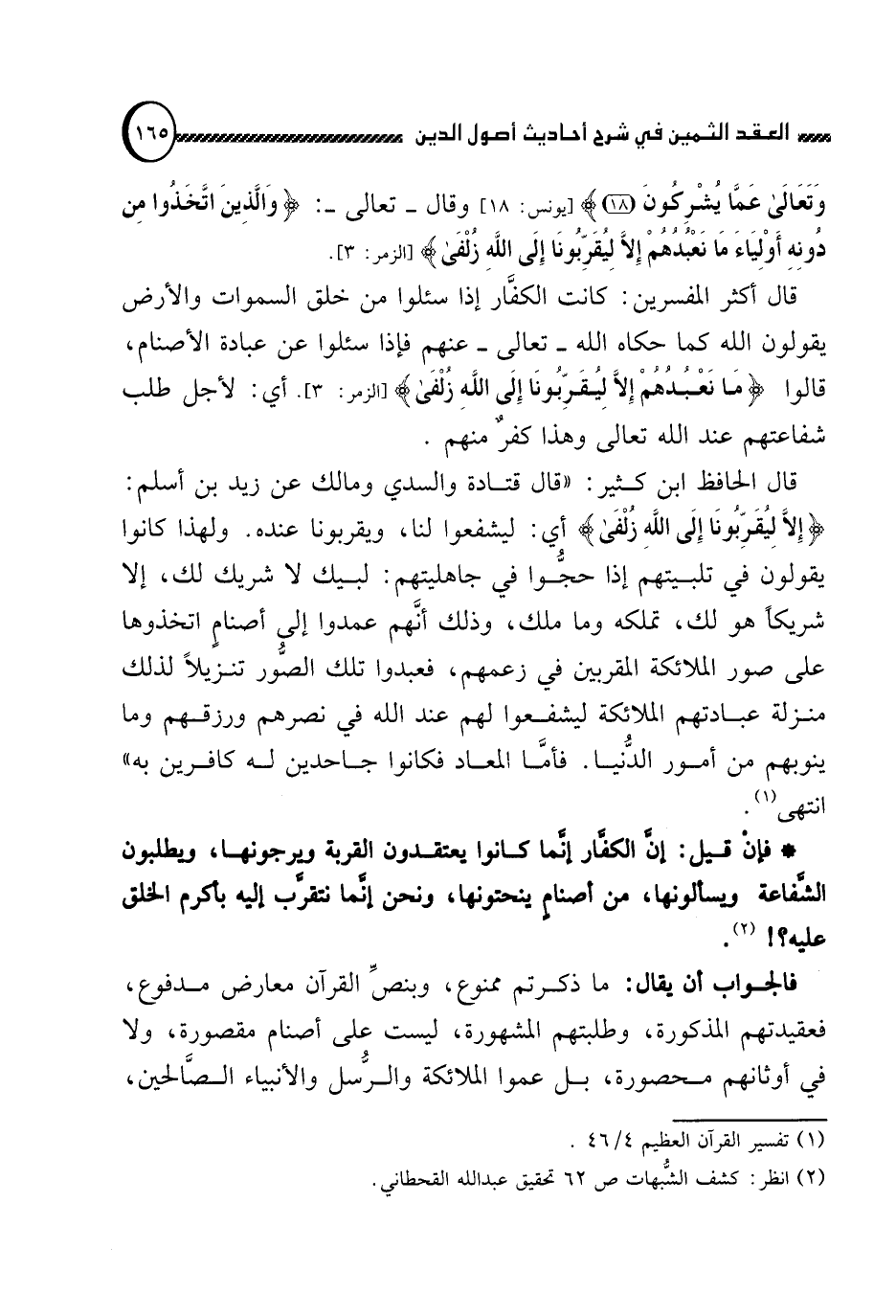 فالجواب أن يقال: ما ذكرتم ممنوع, وبنص القرآن معارض مدفوع, فعقيدتهم المذكورة, وطلبتهم المشهورة, ليست على أصنام مقصورة, ولا في أوثانهم محصورة, بل عموا الملائكة والرسل والأنبياء والصالحين,