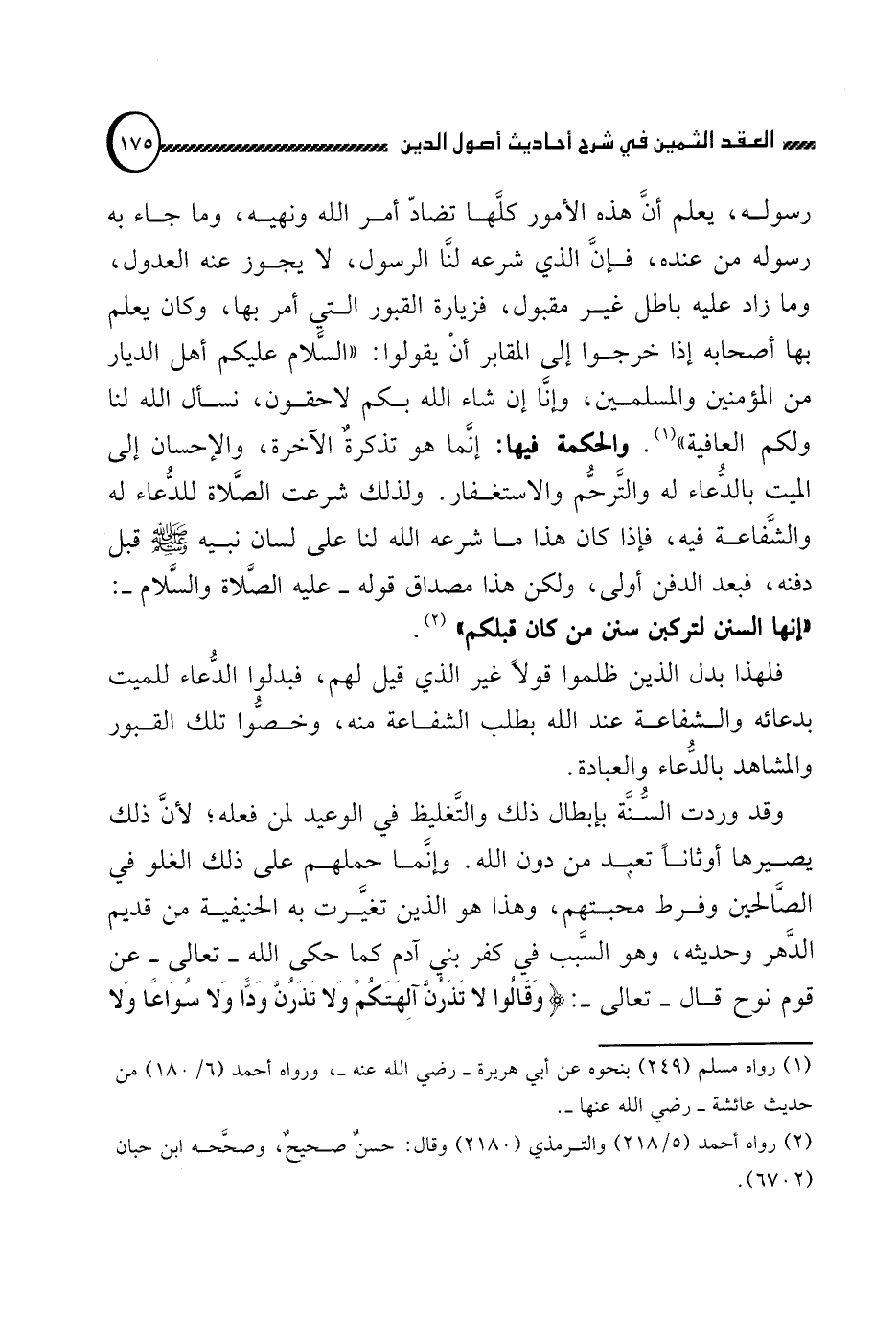 رسوله صلى الله عليه وسلم , يعلم أن هذه الأمور كلها تضاد أمر الله ونهيه, وما جاء به رسوله من عنده, فإن الذي شرعه لنا الرسول, لا يجوز عنه العدول, وما زاد عليه باطل غير مقبول, فزيارة القبور التي أمر بها, وكان يعلم بها أصحابه إذا خرجوا إلى المقابر أن يقولوا: "السلام عليكم أهل الديار من المؤمنين والمسلمين, وإنا إن شاء الله بكم لاحقون, نسأل الله لنا ولكم العافية" (1) . والحكمة فيها: إنما هو تذكرة الآخرة, والإحسان إلى الميت بالدعاء له والترحم والاستغفار. ولذلك شرعت الصلاة للدعاء له والشفاعة فيه, فإذا كان هذا ما شرعه الله لنا على لسان نبيه صلى الله عليه وسلم قبل دفنه, فبعد الدفن أولى, ولكن هذا مصداق قوله صلى الله عليه وسلم: "إنها السنن لتركبن سنن من كان قبلكم2".