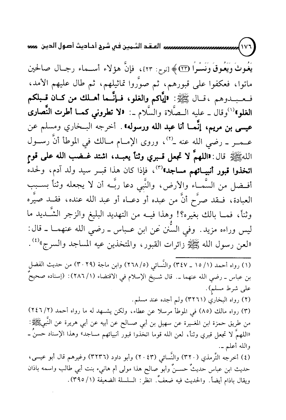 يَغُوثَ وَيَعُوقَ وَنَسْراً} (نوح:23) فإن هؤلاء أسماء رجال صالحين ماتوا, فعكفوا على قبورهم, ثم صوروا تماثيلهم, ثم طال عليهم الأمد, فعبدوهم, قال صلى الله عليه وسلم: "إياكم والغلو, فإنما أهلك من كان قبلكم الغلو" (1) وقال عليه الصلاة والسلام: "لا تطروني كما أطرت النصارى عيسى بن مريم, إنما أنا عبد الله ورسوله". أخرجه البخاري ومسلم عن عمر رضي الله عنه (2) , وروى الإمام مالك في الموطأ أن رسول الله صلى الله عليه وسلم قال: "اللهم لا تجعل قبري وثنا يعبد, اشتد غضب الله على قوم اتخذوا قبور أنبيائهم مساجد" (3) , فإذا كان هذا قبر سيد ولد آدم, ولحده أفضل من السماء والأرض, والنبي دعا ربه أن لا يجعله وثنا بسبب العبادة, فقد صرح أن من عبده أو دعاه أو عبد الله عنده, فقد صيره وثنا, فما بالك بغيره؟! وهذا فيه من التهديد البليغ والزجر الشديد ما ليس وراءه مزيد. وفي السنن عن ابن عباس رضي الله عنهما قال: "لعن رسول الله صلى الله عليه وسلم زائرات القبور, والمتخذين عليه المساجد والسرج" (4) .
