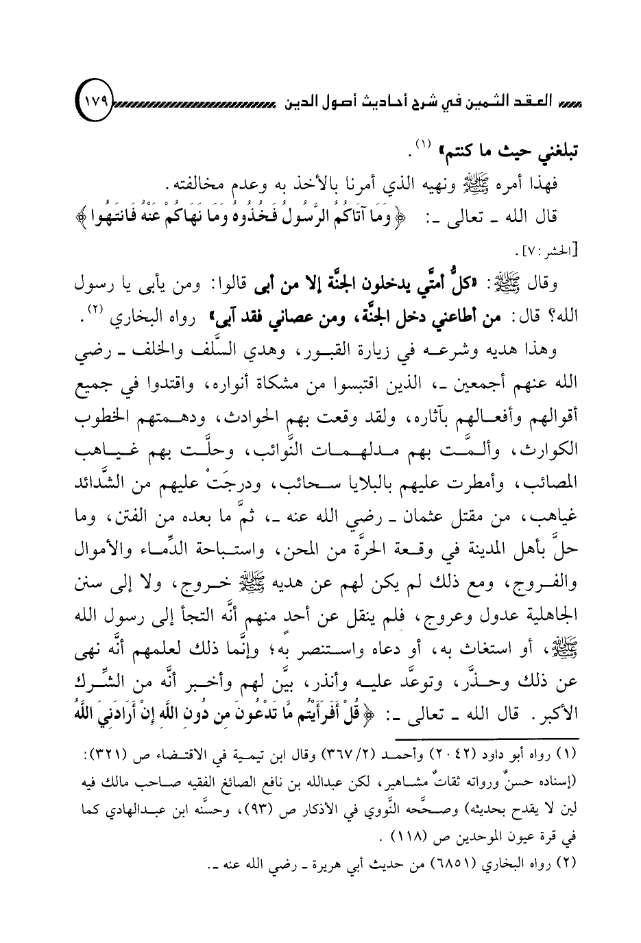 وقال صلى الله عليه وسلم: "كل أم تي يدخلون الجنة إلا من أبى قالوا: ومن يأبى يا رسول الله؟ قال: من أطاعني دخل الجنة, ومن عصاني فقد أبى" رواه البخاري (2) .