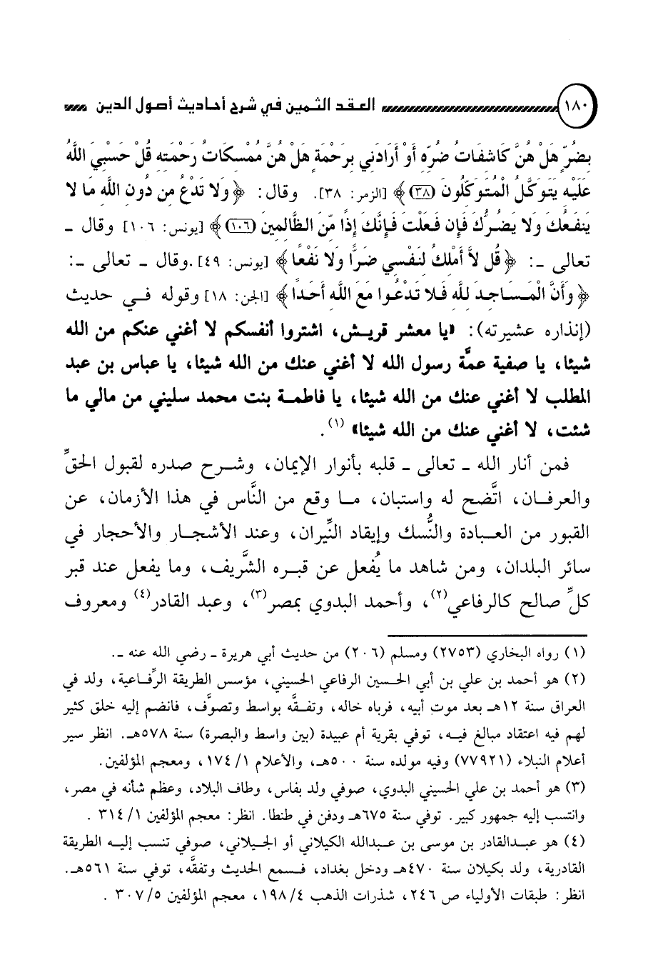 فمن أنار الله تعالى قلبه بأنوار الإيمان, وشرح صدره لقبول الحق والعرفان, اتضح له واستبان, ما وقع من الناس في الأزمان, عن القبور من العبادة والنسك وإيقاد النيران, وعند الأشجار والأحجار في سائر البلدان, ومن شاهد ما يفعل عن قبره الشريف, وما يفعل عند قبر كل صالح كالرفاعي (2) , وأحمد البدوي بمصر (3) , وعبد القادر (4) ومعروف