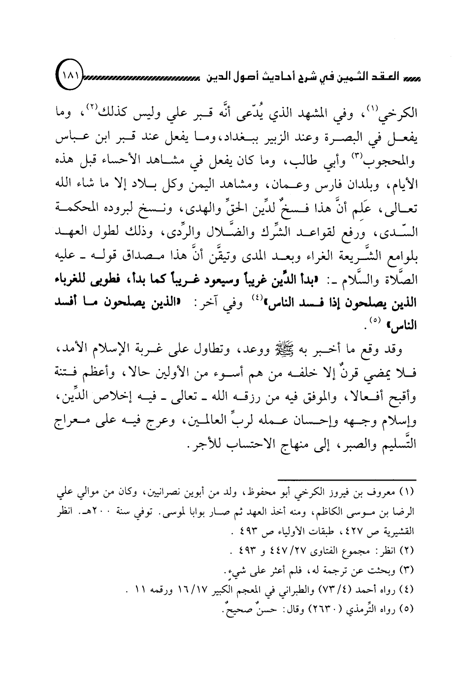 الكرخي (1) , وفي المشهد الذي يدعى أنه قبر علي وليس كذلك (2) , وما يفعل في البصرة وعند الزبير ببغداد, وما يفعل عند قبر ابن عباس والمحجوب (3) وأبي طالب, وما كان يفعل في مشاهد الأحساء قبل هذه الأيام, وبلدان فارس وعمان, ومشاهد اليمن وكل بلاد إلا ما شاء الله تعالى, علم أن هذا فسخ لدين الحق والهدى, ونسخ لبروده المحكمة السدى, ورفع لقواعد الشرك والضلال والردى, وذلك لطول العهد بلوامع الشريعة الغراء وبعد المدى وتيقن أن هذا مصداق قوله عليه الصلاة والسلام: "بدأ الدين غريبا وسيعود غريبا كما بدأ, فطوبى للغرباء الذين يصلحون إذا فسد الناس" (4) وفي آخر: "الذين يصلحون ما أفسد الناس" (5) .