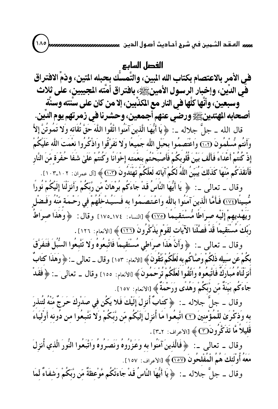الفصل السابع: في الأمر بالاعتصام بكتاب الله المبين, والتمسك بحبله المتين, وذم الافتراق في الدين, وإخبار الرسول الأمين صلى الله عليه وسلم , بافتراق أمته المجيبين, على ثلاث وسبعين, وأنها كلها في النار مع المكذبين, إلا من كان على سنته وسنة أصحابه المهندين صلى الله عليه وسلم ورضي عنهم أجمعين, وحشرنا في زمرتهم يوم الدين.