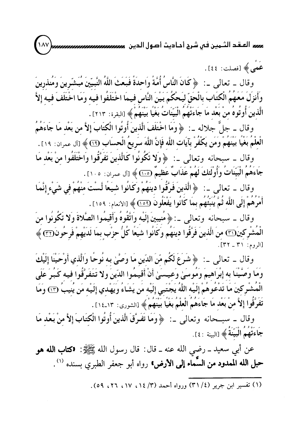 وقال تعالى: {كَانَ النَّاسُ أُمَّةً وَاحِدَةً فَبَعَثَ اللَّهُ النَّبِيِّينَ مُبَشِّرِينَ وَمُنْذِرِينَ وَأَنْزَل مَعَهُمُ الْكِتَابَ بِالْحَقِّ لِيَحْكُمَ بَيْنَ النَّاسِ فِيمَا اخْتَلفُوا فِيهِ وَمَا اخْتَلفَ فِيهِ إِلاَّ الَّذِينَ أُوتُوهُ مِنْ بَعْدِ مَا جَاءَتْهُمُ الْبَيِّنَاتُ بَغْياً بَيْنَهُمْ} (البقرة: من الآية 213) .
