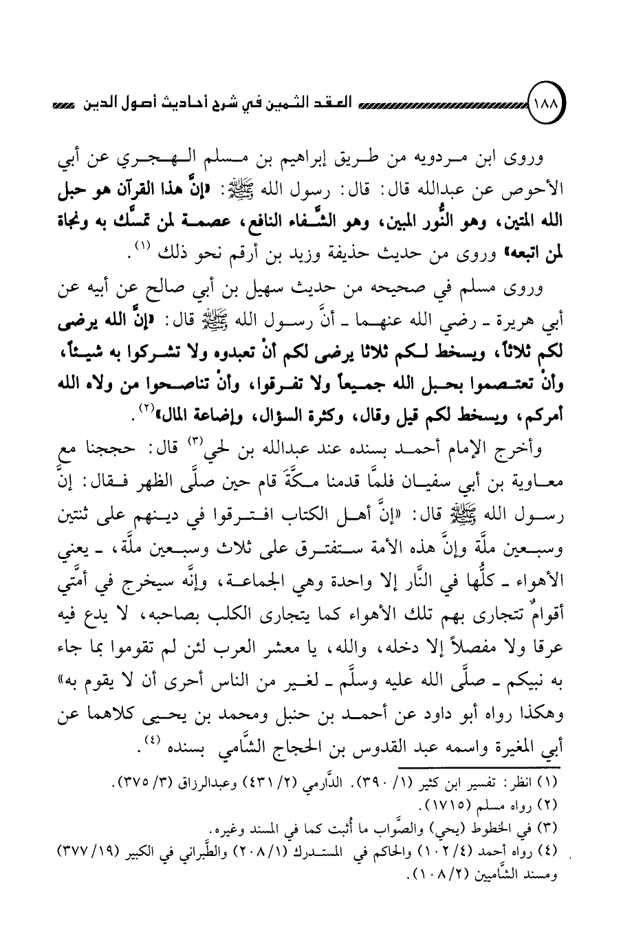 وروى ابن مردوية من طريق إبراهيم بن مسلم الهجري عن أبي الأحوص عن عبد الله قال: قال: رسول الله صلى الله عليه وسلم: "إن هذا القرآن هو حبل الله المتين, وهو النور المبين, وهو الشفاء النافع, عصمة لمن تمسك به ونجاة لمن اتبعه" وروى من حديث حذيفة وزيد بن أرقم نحو ذلك (1) .