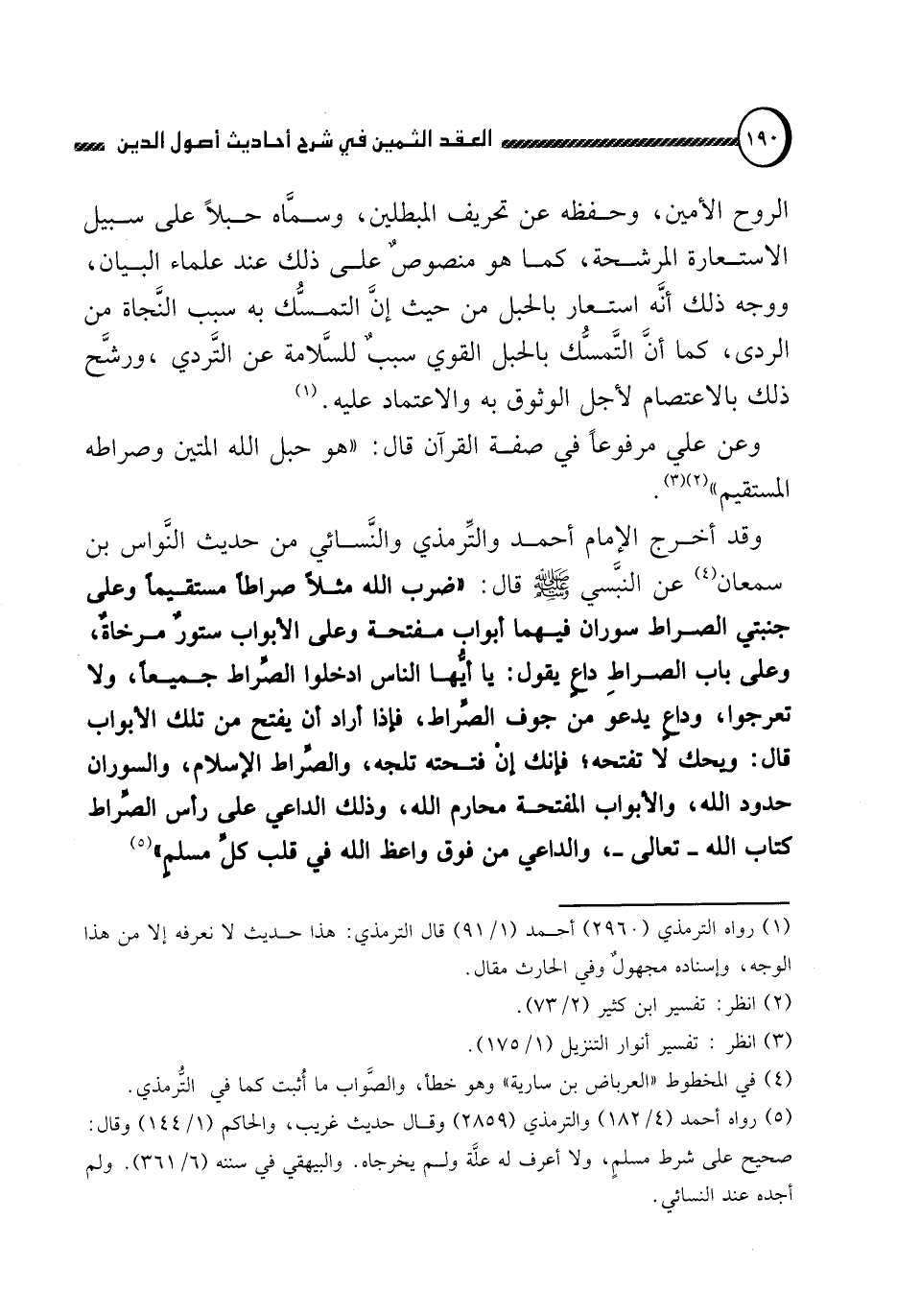 الروح الأمين, وحفظه عن تحريف المبطلين, وسماه حبلا على سبيل الاستعارة المرشحة, كما هو منصوص على ذلك عند علماء البيان, ووجه ذلك انه استعار بالحبل من حيث إنّ التمسك به سبب النجاة من الردى, كما أن التمسك بالحبل القوي سبب للسلامة عن التردي, ورشح ذلك بالاعتصام لأجل الوثوق به والاعتماد عليه. (1)