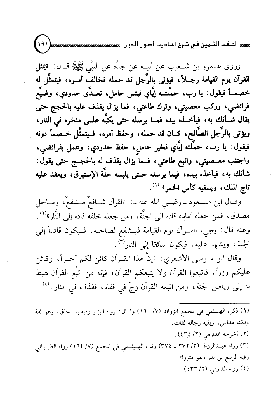 وروى عمرو بن شعيب عن أبيه عن جده عن النبي صلى الله عليه وسلم قال: "يمثل القرآن يوم القيامة رجلا, فيؤتى بالرجل قد حمله فخالف أمره, فيتمثل له خصما فيقول: يا رب, حملته إياي فبئس حامل, تعدى حدودي, وضيع فرائضي, وركب معصيتي, وترك طاعتي, فما يزال يقذف عليه بالحجج حتى يقال شأنك به, فيأخذه بيده فما يرسله حتى يكبه على منخره في النار, ويؤتى بالرجل الصالح, كان قد حمله, وحفظ أمره, فيتمثل خصما دونه فيقول: يا رب, حملته إياي فخير حامل, حفظ حدودي , وعمل بفرائضي, واجتنب معصيتي, واتبع طاعتي, فما يزال يقذف له بالحجج حتى يقول: شأنك به, فيأخذه بيده فيما يرسله حتى يلبسه حلة الإستبرق, ويعقد عليه تاج الملك, ويسقيه كأس الخمر" (1) .