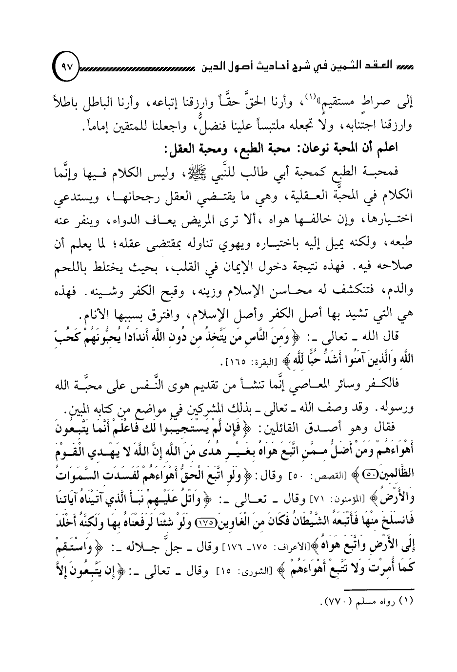 فالكافر وسائر المعاصي إنما تنشأ من تقديم هوى النفس على محبة الله ورسوله. وقد وصف الله تعالى بذلك المشركين في مواضع من كتابه المبين. فقال وهو أصدق القائلين: {فَإِنْ لمْ يَسْتَجِيبُوا لكَ فَاعْلمْ أَنَّمَا يَتَّبِعُونَ أَهْوَاءَهُمْ وَمَنْ أَضَلُّ مِمَّنِ اتَّبَعَ هَوَاهُ بِغَيْرِ هُدىً مِنَ اللَّهِ إِنَّ اللَّهَ لا يَهْدِي الْقَوْمَ الظَّالِمِينَ} (القصص:50) . وقال: {وَلوِ اتَّبَعَ الْحَقُّ أَهْوَاءَهُمْ لفَسَدَتِ السَّمَاوَاتُ وَالْأَرْضُ} (المؤمنون: من الآية 71) وقال تعالى: {وَاتْلُ عَليْهِمْ نَبَأَ الَّذِي آتَيْنَاهُ آيَاتِنَا فَانْسَلخَ مِنْهَا فَأَتْبَعَهُ الشَّيْطَانُ فَكَانَ مِنَ الْغَاوِينَ وَلوْ شِئْنَا لرَفَعْنَاهُ بِهَا وَلكِنَّهُ أَخْلدَ إِلى الْأَرْضِ وَاتَّبَعَ هَوَاهُ} (الأعراف: من الآية 175-176) وقال جل جلاله: {وَاسْتَقِمْ كَمَا أُمِرْتَ وَلا تَتَّبِعْ أَهْوَاءَهُمْ} (الشورى: من الآية 15) وقال تعالى: {إِنْ يَتَّبِعُونَ إِلاَّ