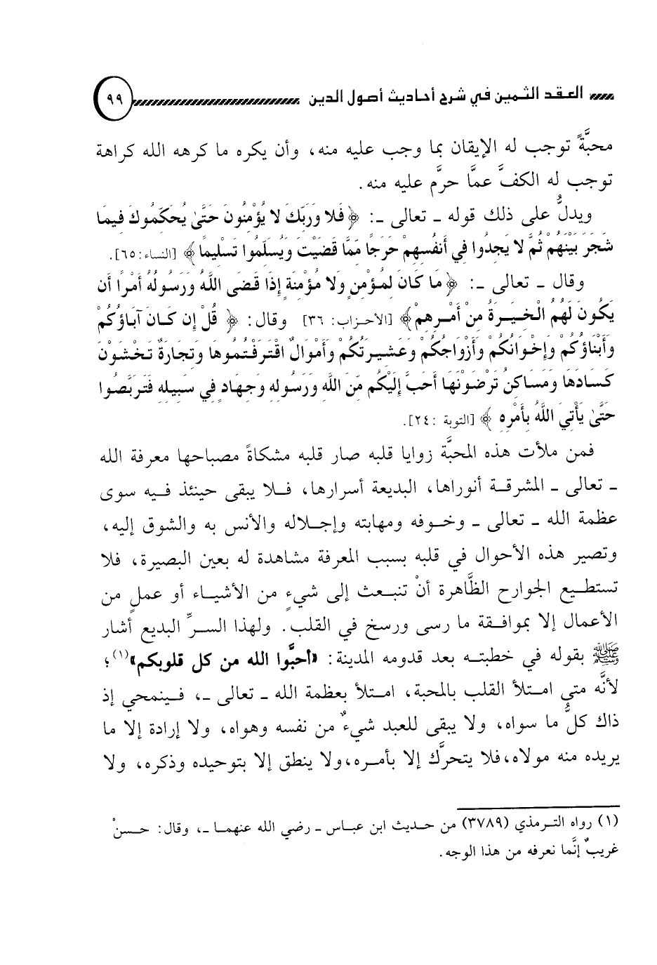 فمن ملأت هذه المحبة زوايا قلبه صار قلبه مشكاة مصباحها معرفة الله تعالى المشرقة أنوارها, البديعة أسرارها, فلا يبقى حينئذ فيه سوى عظمة الله تعالى وخوفه ومهابته وإجلاله والأنس به والشوق إليه, وتصير هذه الأحوال في قليه بسبب المعرفة مشاهدة له بعين البصيرة, فلا تستطيع الجوارح الظاهرة أن تبعث إلى شيء من الأشياء أو عمل من الأعمال إلا بموافقة ما رسى ورسخ في القلب. ولهذا السر البديع أشار صلى الله عليه وسلم بقوله في خطبته بعد قدومه المدينة: "أحبوا الله من كل قلوبكم" (1) ؛ لأنه متى امتلأ بعظمة الله تعالى, فينمحي إذ ذاك كل ما سواه, ولا يبقى للعبد شيء من نفسه وهواه, ولا إرادة إلا ما يريده منه مولاه, فلا يتحرك إلا بأمره, ولا ينطق إلا بتوحيده وذكره, ولا