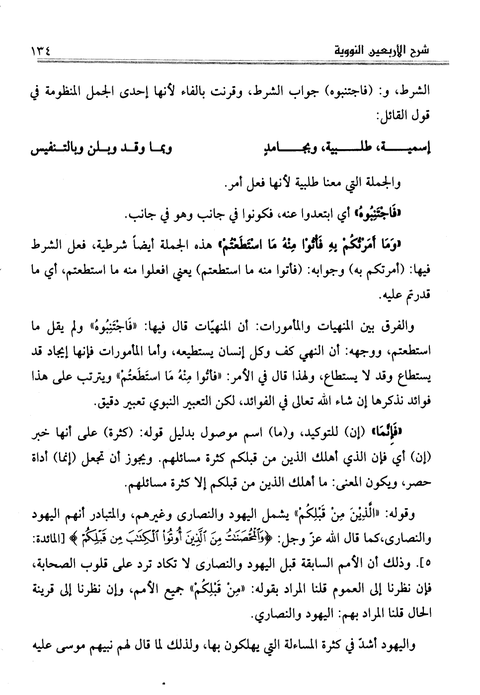 والفرق بين المنهيات والمأمورات: أن المنهيّات قال فيها: فَاجْتَنِبُوهُ ولم يقل ما استطعتم، ووجهه: أن النهي كف وكل إنسان يستطيعه، وأما المأمورات فإنها إيجاد قد يستطاع وقد لا يستطاع، ولهذا قال في الأمر: فأتُوا مِنْهُ مَا استَطَعتُمْ ويترتب على هذا فوائد نذكرها إن شاء الله تعالى في الفوائد، لكن التعبير النبوي تعبير دقيق.