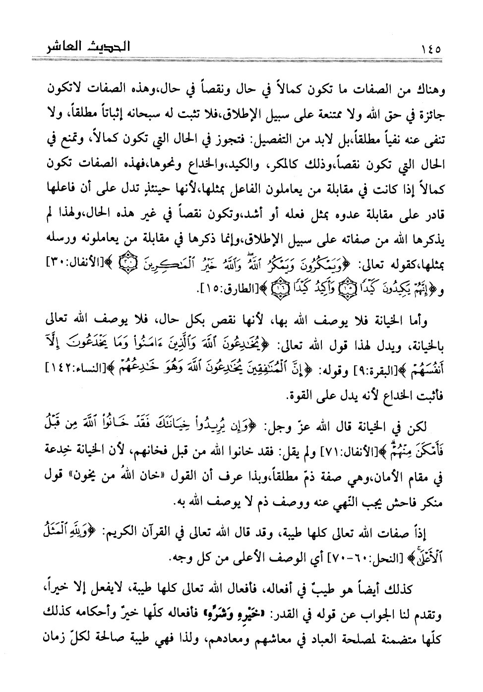 وهناك من الصفات ما تكون كمالاً في حال ونقصاً في حال، وهذه الصفات لاتكون جائزة في حق الله ولا ممتنعة على سبيل الإطلاق، فلا تثبت له سبحانه إثباتاً مطلقاً، ولا تنفى عنه نفياً مطلقاً، بل لابد من التفصيل: فتجوز في الحال التي تكون كمالاً، وتمنع في الحال التي تكون نقصاً، وذلك كالمكر، والكيد، والخداع ونحوها، فهذه الصفات تكون كمالاً إذا كانت في مقابلة من يعاملون الفاعل بمثلها، لأنها حينئذٍ تدل على أن فاعلها قادر على مقابلة عدوه بمثل فعله أو أشد، وتكون نقصاً في غير هذه الحال، ولهذا لم يذكرها الله من صفاته على سبيل الإطلاق، وإنما ذكرها في مقابلة من يعاملونه ورسله بمثلها، كقوله تعالى: (وَيَمْكُرُونَ وَيَمْكُرُ اللَّهُ وَاللَّهُ خَيْرُ الْمَاكِرِينَ) (الأنفال: الآية30) و (إِنَّهُمْ يَكِيدُونَ كَيْداً* وَأَكِيدُ كَيْداً) (الطارق: 15 (.