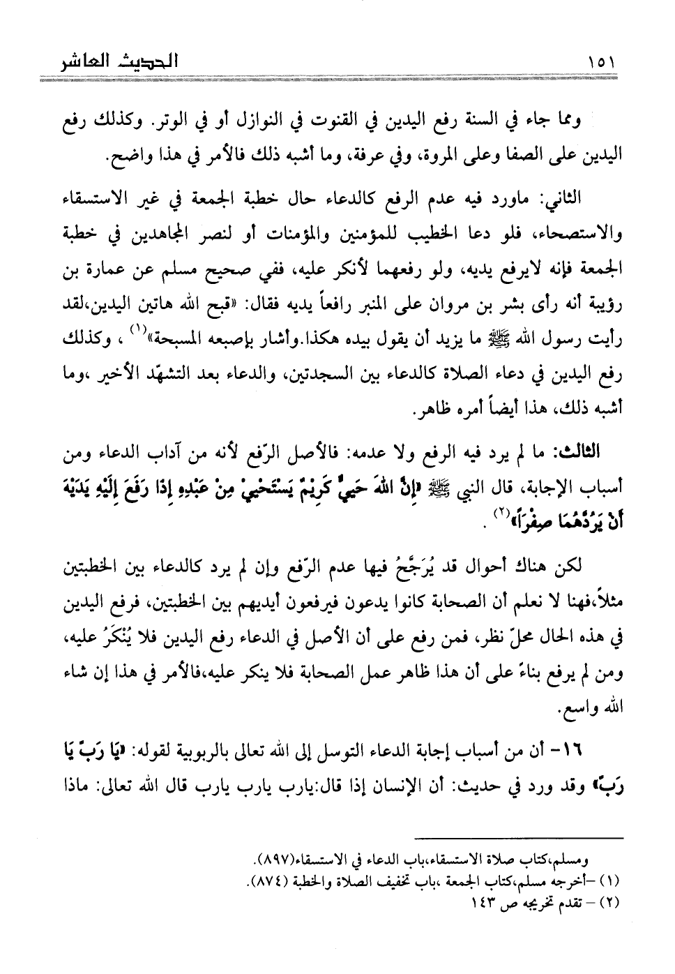 الثاني: ماورد فيه عدم الرفع كالدعاء حال خطبة الجمعة في غير الاستسقاء والاستصحاء، فلو دعا الخطيب للمؤمنين والمؤمنات أو لنصر المجاهدين في خطبة الجمعة فإنه لايرفع يديه، ولو رفعهما لأنكر عليه، ففي صحيح مسلم عن عمارة بن رؤيبة أنه رأى بشر بن مروان على المنبر رافعاً يديه فقال: "قبح الله هاتين اليدين، لقد رأيت رسول الله صلى الله عليه وسلم ما يزيد أن يقول بيده هكذا. وأشار بإصبعه المسبحة" (¬1) ، وكذلك رفع اليدين في دعاء الصلاة كالدعاء بين السجدتين، والدعاء بعد التشهّد الأخير، وما أشبه ذلك، هذا أيضاً أمره ظاهر.