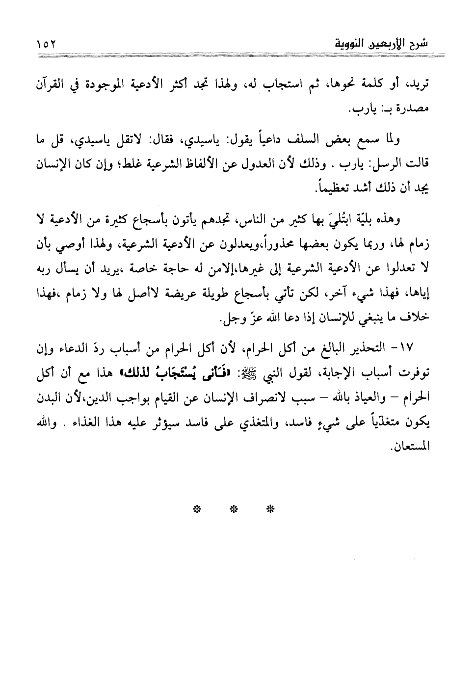 . 17التحذير البالغ من أكل الحرام، لأن أكل الحرام من أسباب ردّ الدعاء وإن توفرت أسباب الإجابة، لقول النبي صلى الله عليه وسلم: "فََأنى يُسْتَجَابُ لذلك" هذا مع أن أكل الحرام - والعياذ بالله - سبب لانصراف الإنسان عن القيام بواجب الدين، لأن البدن يكون متغذّياً على شيءٍ فاسد، والمتغذي على فاسد سيؤثر عليه هذا الغذاء. والله المستعان.