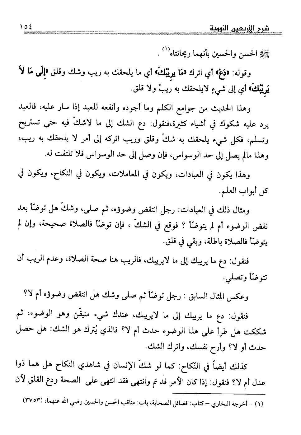 فنقول: دع ما يريبك إلى ما لايريبك، فالريب هنا صحة الصلاة، وعدم الريب أن تتوضّأ وتصلي.