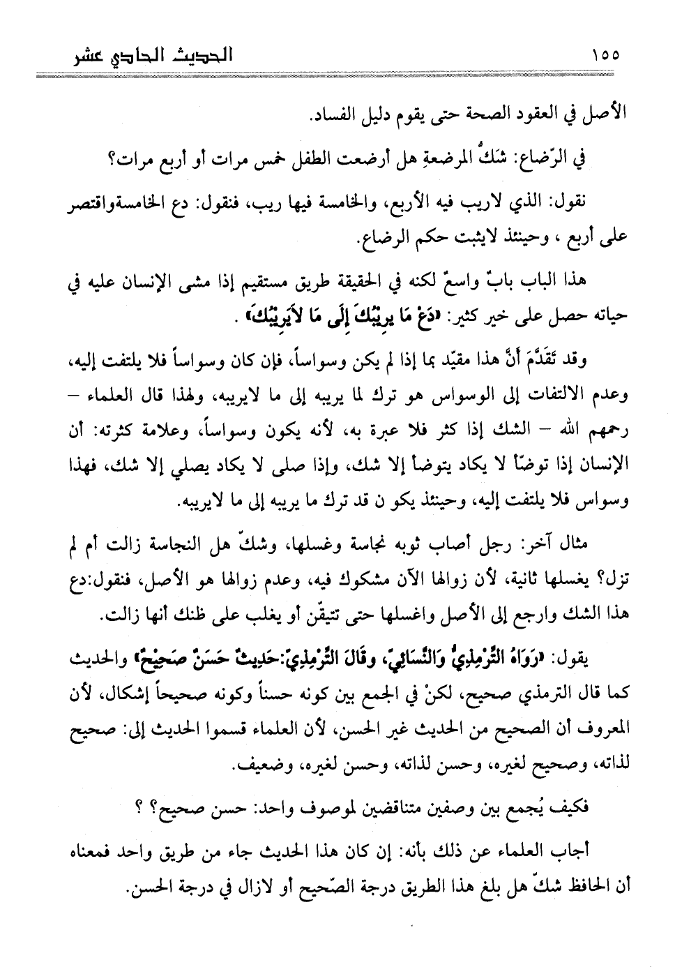وقد تَقَدَّمَ أَنَّ هذا مقيّد بما إذا لم يكن وسواساً، فإن كان وسواساً فلا يلتفت إليه، وعدم الالتفات إلى الوسواس هو ترك لما يريبه إلى ما لايريبه، ولهذا قال العلماء - رحمهم الله - الشك إذا كثر فلا عبرة به، لأنه يكون وسواساً، وعلامة كثرته: أن الإنسان إذا توضّأ لا يكاد يتوضأ إلا شك، وإذا صلى لا يكاد يصلي إلا شك، فهذا وسواس فلا يلتفت إليه، وحينئذ يكو ن قد ترك ما يريبه إلى ما لايريبه.