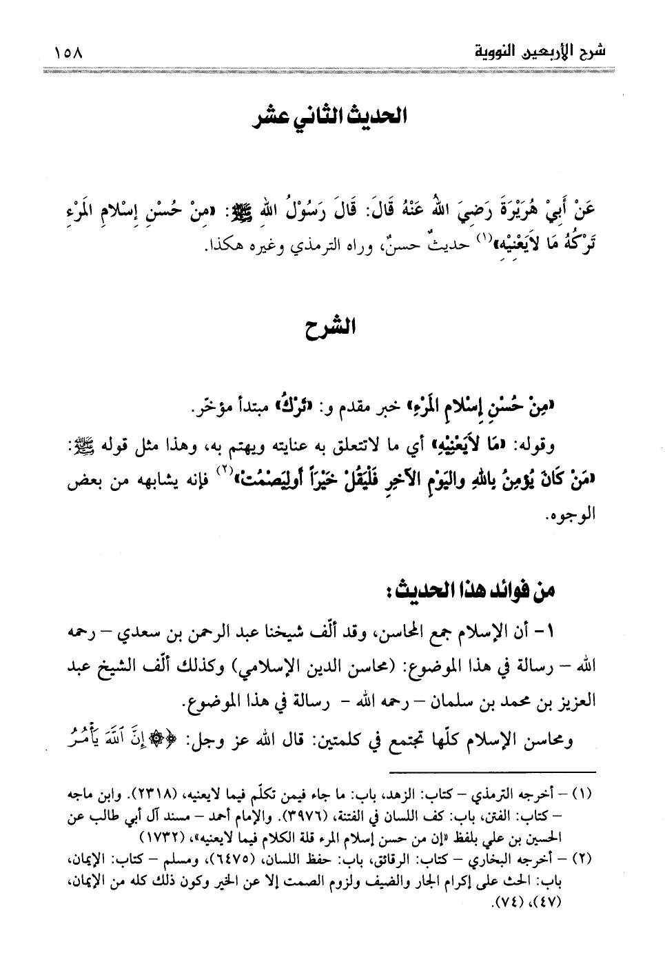 (¬1) - أخرجه الترمذي - كتاب: الزهد، باب: ما جاء فيمن تكلم فيما لا يعينه، (2318) . وابن ماجه - كتاب: الفتن، باب: كف اللسان في الفتنة، (3976) . والإمام أحمد- مسند آل أبي طالب عن الحسين بن علي بلفظ "إن من حسن إسلام المرء قلة الكلام فيما لا يعينه"، (1732)
