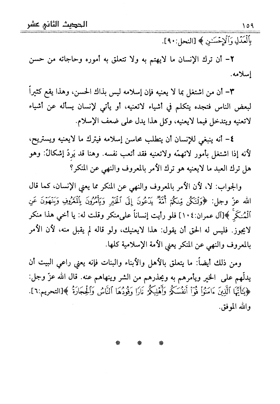 . 4أنه ينبغي للإنسان أن يتطلب محاسن إسلامه فيترك ما لايعنيه ويستريح، لأنه إذا اشتغل بأمور لاتهمّه ولاتعنيه فقد أتعب نفسه. وهنا قد يَرِدُ إشكالٌ: وهو هل ترك العبد ما لايعنيه هو ترك الأمر بالمعروف والنهي عن المنكر؟