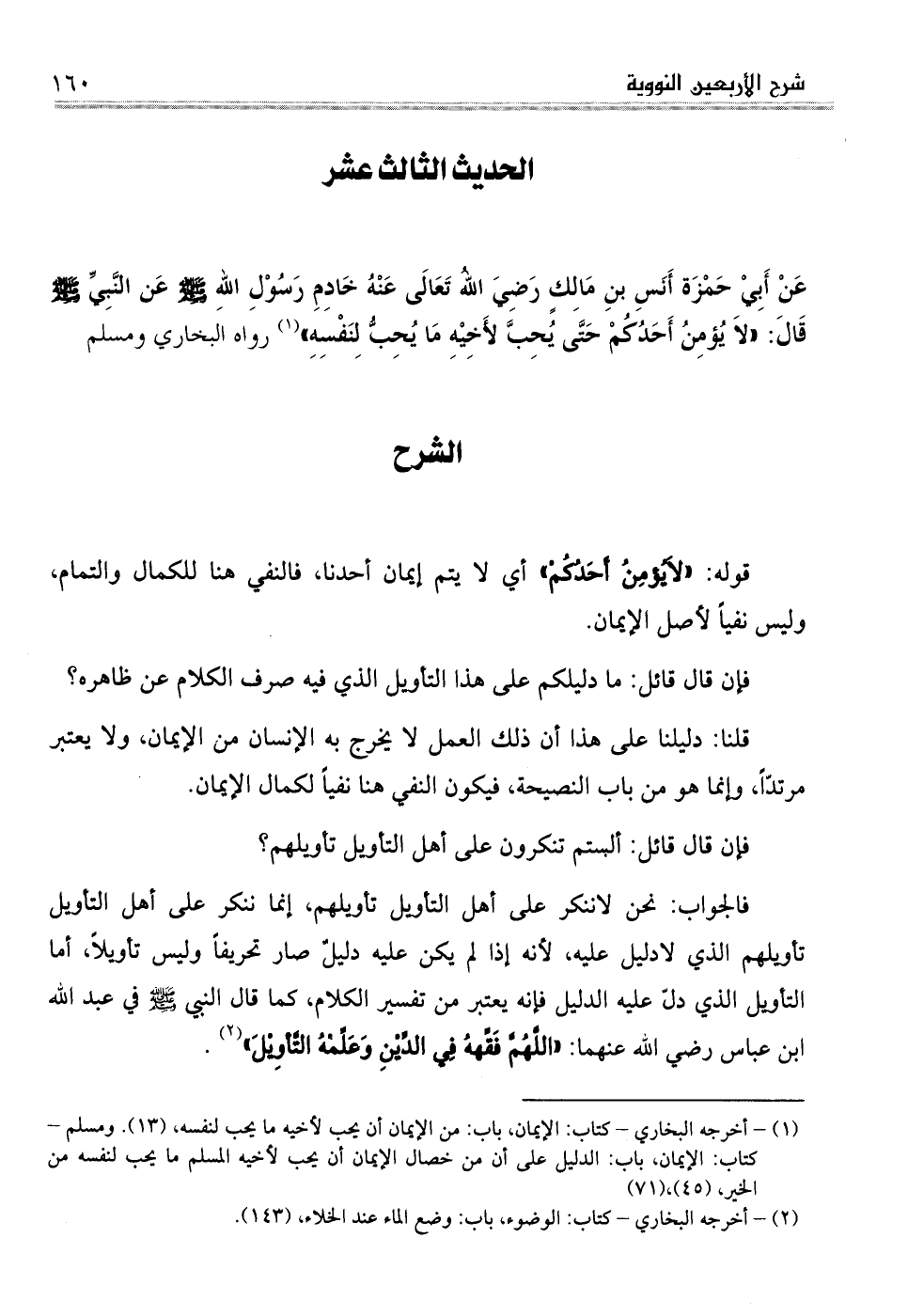 (¬1) - أخرجه البخاري - كتاب: الإيمان، باب: من الإيمان أن يحب لأخيه ما يحب لنفسه، (13) . ومسلم - كتاب: الإيمان، باب: الدليل على أن من خصال الإيمان أن يحب لأخيه المسلم ما يحب لنفسه من الخير، (45) ، (71)