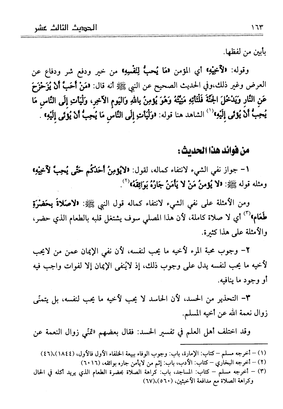. 2وجوب محبة المرء لأخيه ما يحب لنفسه، لأن نفي الإيمان عن من لايحب لأخيه ما يحب لنفسه يدل على وجوب ذلك، إذ لايُنفى الإيمان إلا لفوات واجب فيه أو وجود ما ينافيه.