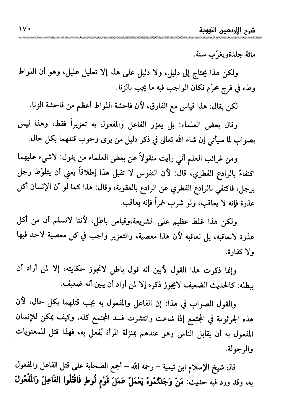 ومن غرائب العلم أني رأيت منقولاً عن بعض العلماء من يقول: لاشيء عليهما اكتفاءً بالرادع الفطري، قال: لأن النفوس لا تقبل هذا إطلاقاً يعني أن يتلوّط رجل برجل، فاكتفي بالرادع الفطري عن الرادع بالعقوبة، وقال: هذا كما لو أن الإنسان أكل عذرة فإنه لا يعاقب، ولو شرب خمراً فإنه يعاقب.