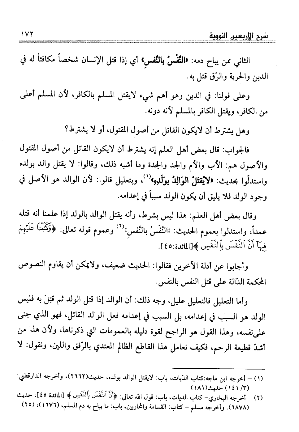 الثاني ممن يباح دمه: "النَّفْسُ بالنَّفسِ" أي إذا قتل الإنسان شخصاً مكافئاً له في الدين والحرية والرّق قتل به.